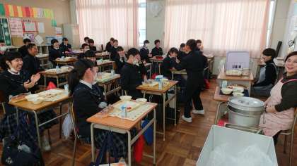 2年1組では、6時限目の授業補てんに向けて、「いただきます!」の前に一発ギャグだそうです。