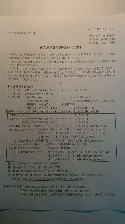 明日、15時30分〜、本校体育館において、「新入生保護者説明会」を開催します。