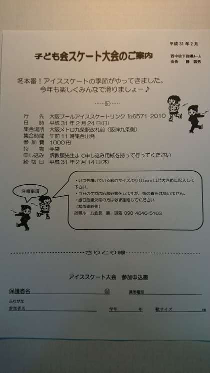 「子ども会スケート大会」のご案内(西中校下指導ルームより)を配付していますので、ご覧ください。