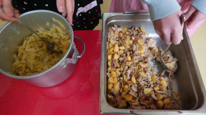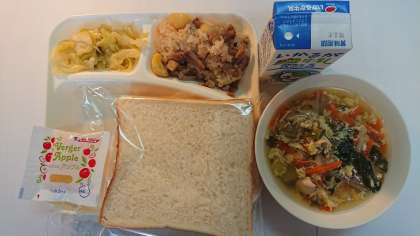 本日の献立は、中華おこわ、キャベツのオイスターソース炒め、卵スープ、食パン、りんごジャム、牛乳です。