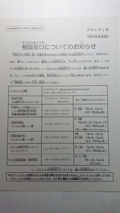 ご覧のような、大阪市教育委員会からの「相談窓口についてのお知らせ」を生徒の皆さんに配付していますのでお知りおきください。