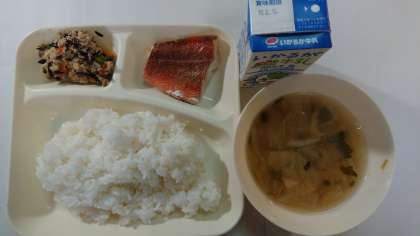 本日の献立は、赤魚のレモン醤油かけ、高野豆腐の炒り煮、うすくず汁、ごはん、牛乳です。