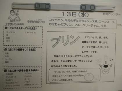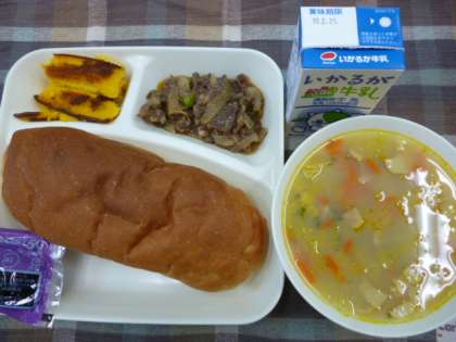 本日の献立は、牛肉のデミグラソース煮、コーンスープ、かぼちゃのプリン、ブルーベリージャム、コッペパン、牛乳です。