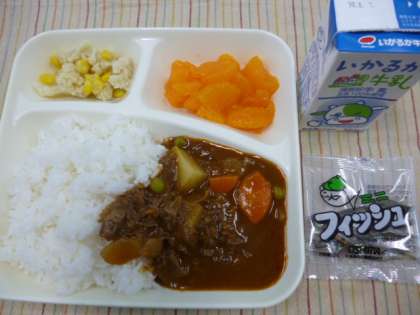 本日の献立は、ハヤシライス、カリフラワーとコーンのサラダ、みかん、ミニフィッシュ、牛乳です。