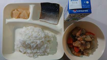 本日の献立は、さばの塩焼き、厚揚げと里芋の煮物、大根のみそ煮、ごはん、牛乳です。