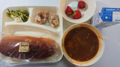 本日の「卒業祝い献立」は、フライドチキン、カレーシチュー、春のカラフルソテー、いちご、おさつパン、バター、牛乳です。