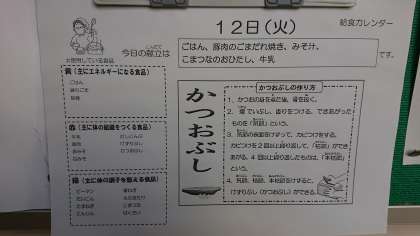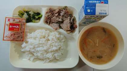本日の献立は、豚肉のごまだれ焼き、小松菜のおひたし、かつおぶし、ごはん、味噌汁、牛乳です。