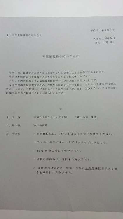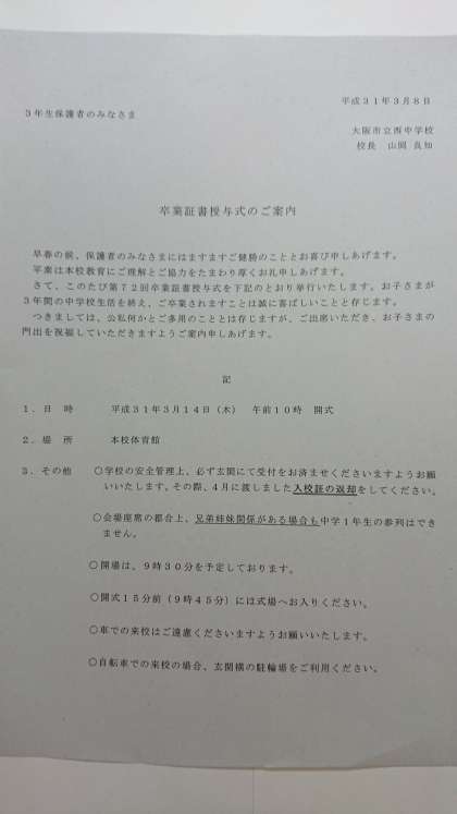 3年生保護者の皆様あてと、1・2年生保護者の皆様あてに、別々の「卒業証書授与式のご案内」を配付していますのでご覧ください。