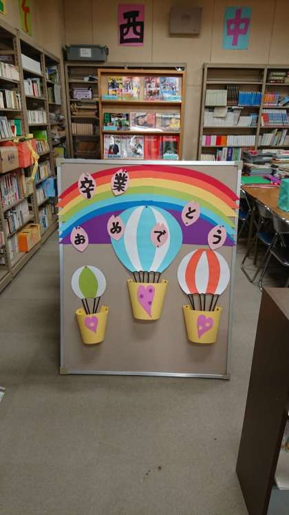 学校図書館補助員さんが、図書館の入り口の飾りつけを「卒業おめでとう」バージョンにかえてくださっています。
