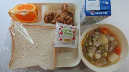 本日の献立は、鶏肉の味噌バターソース、スープ煮、食パン、ジャム、牛乳、デコポンです。