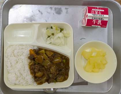 本日のメニューは、 牛乳 ビーフカレーライス 野菜のピクルス りんご でした。