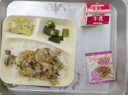 本日のメニューは、牛乳 他人丼 ささみとキャベツのいためもの オクラの甘酢あえ いもけんぴフィッシュ でした。
