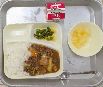 本日のメニューは、ごはん 牛乳 ハヤシライス グリーンアスパラガスとコーンのサラダ 洋なし でした。