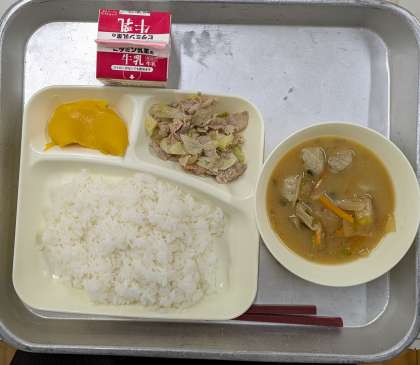 本日のメニューは、ごはん 牛乳 豚肉と野菜のいためもの いわしのつみれ汁 かぼちゃういろう でした。
