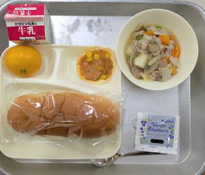 本日のメニューは、コッペパン 牛乳 豚肉と野菜のスープ煮 変わりピザ みかん ブルーベリージャム でした。