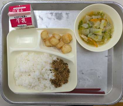 本日のメニューは、ごはん 牛乳 いかてんぷら 五目汁 おかかなっ葉 でした。
