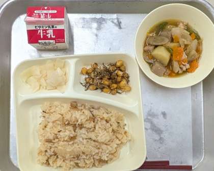 本日のメニューは、かやくご飯 牛乳 鶏肉と野菜の煮もの じゃこ豆 かぶのゆず風味 でした。