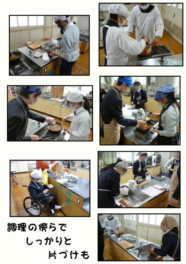 水曜日の1組の調理実習に続き、2組でもドライカレー作りをしました。家庭でお手伝いをしている人も多いのか、手際よく調理している生徒もいました。