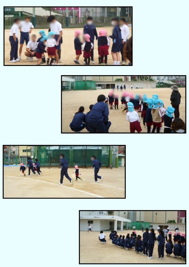 家庭科で「乳幼児」の成長過程や心と体の発達、遊びなどについて学習したことを活かして、九条幼稚園の園児たちと毎年恒例となった交流会を行いました。今年は、「お兄ちゃん、お姉ちゃんたちのかっこいいかけっこが見たい!」という園児たちのリクエストに応えて、中3生がリレーのデモンストレーションを行いました。3年生手作りの絵本を読み聞かせたり、一緒にかけっこをしたり、と楽しいひと時を過ごしました。