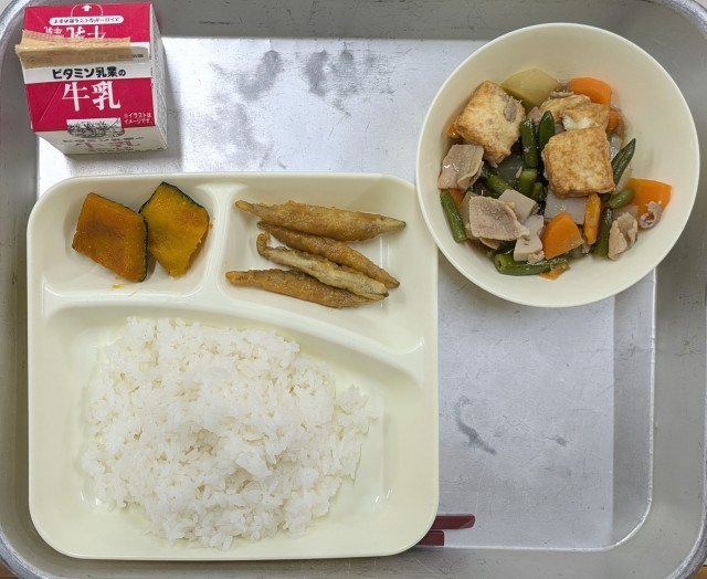 本日のメニューは、ごはん 牛乳 きびなごてんぷら 豚肉とあつあげの煮もの 焼きかぼちゃの甘みつかけ でした。