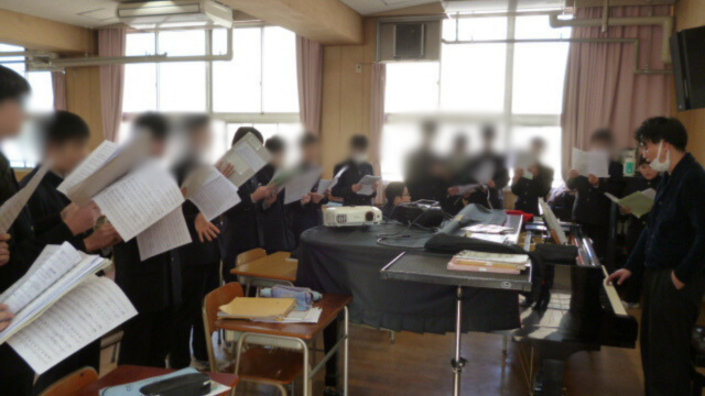男性パート、女性パートに分かれて「栄光の架橋」の合唱曲練習をしています。