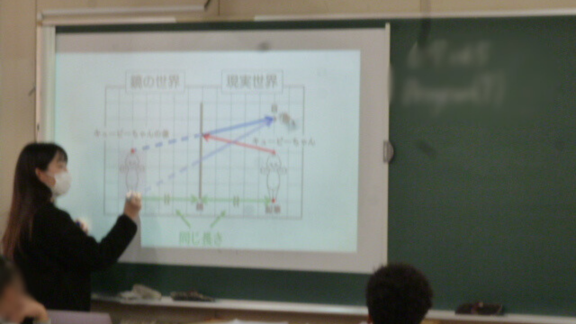 光の反射について学習しています。鏡に映った自分の姿がどのように見えるのか、作図してわかることを知りました。