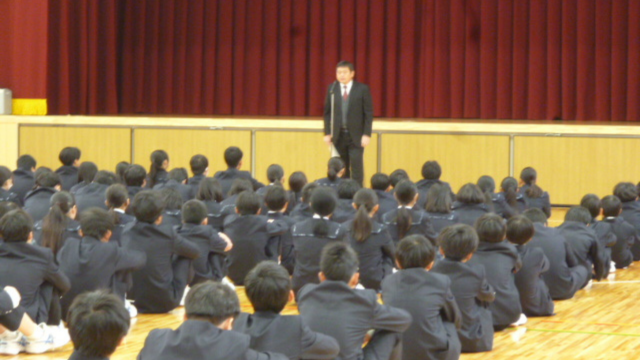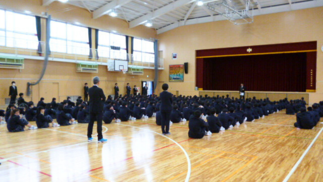 終業式の様子。長期休暇に入りますが、健康に気をつけ、何か困ったことがあれば一人で悩まず周囲の人に相談してください。元気に3学期の始業式に会えることを楽しみにしています、と校長先生よりお話がありました。