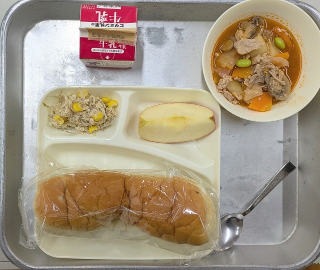 本日のメニューは、おさつパン 牛乳 ケチャップ煮 ささみと野菜のソテー りんご でした。