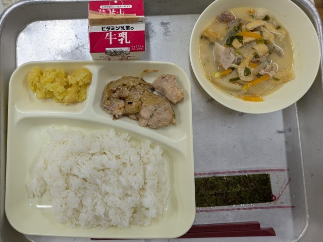 本日のメニューは、ごはん 牛乳 鶏肉の塩こうじ焼き かす汁 くりきんとん 焼きのり でした。