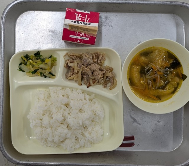 本日のメニューは、ごはん 牛乳 豚肉のスタミナ焼き 五目汁 きくなとはくさいのおひたし でした。