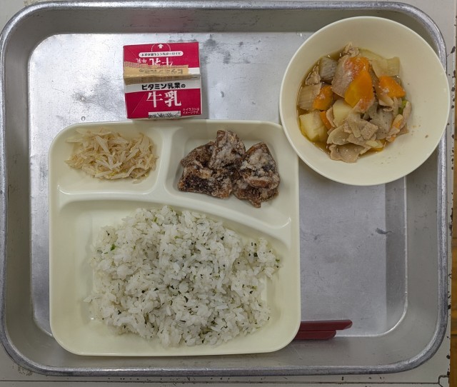 本日のメニューは、菜飯 牛乳 くじらのたつたあげ 豚肉とじゃがいもの煮もの もやしの甘酢あえ でした。