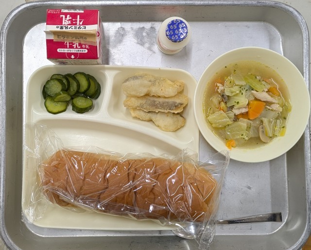 本日のメニューは、黒糖パン 牛乳 白身魚フリッター スープ煮 きゅうりのピクルス 発酵乳 でした。