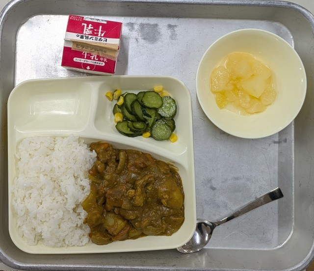 本日のメニューは、ごはん 牛乳 チキンレバーカレーライス きゅうりとコーンのサラダ 洋なし でした。