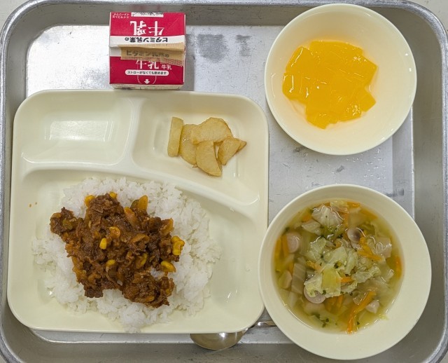 本日のメニューは、ごはん 牛乳 ビーフケチャップライス(具) フライドポテト キャベツのスープ ダイスゼリー でした。