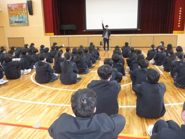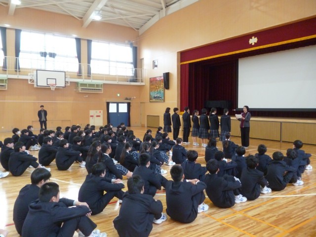 1年生学年集会では、後期学級代表からの一言、漢字・英語の表彰がありました。また、学年教員より生活面・健康面・学習面についてお話がありました。
