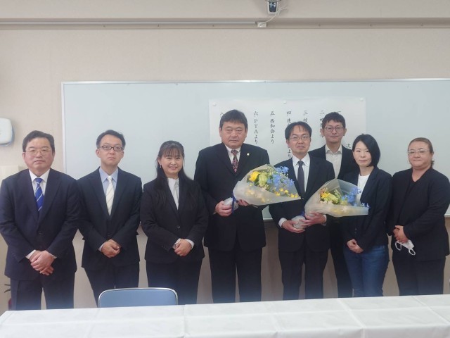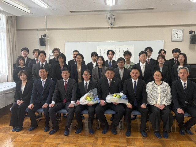 田中 節 校長先生と難波 厚之先生の異動に伴い、離任式を行いました。