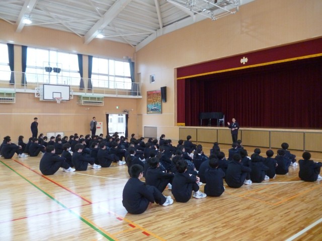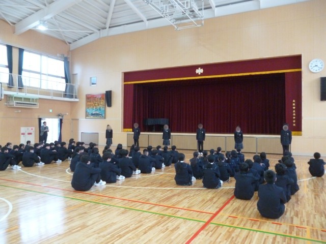 本日2年生学年集会では、前期学級代表になった6名から意気込みの発表がありました。また、学年教員から、校外学習について、スポーツ大会について、委員会活動についてのお話がありました。