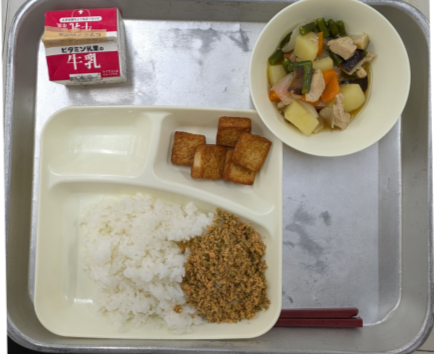 本日のメニューは、ごはん 牛乳 鶏肉とじゃがいもの煮もの あつあげのしょうゆだれかけ 紅ざけそぼろ でした。