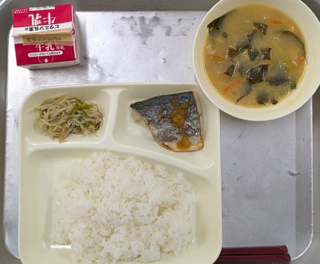 本日のメニューは、ごはん 牛乳 さごしのおろしじょうゆかけ みそ汁 もやしとピーマンのいためもの でした。