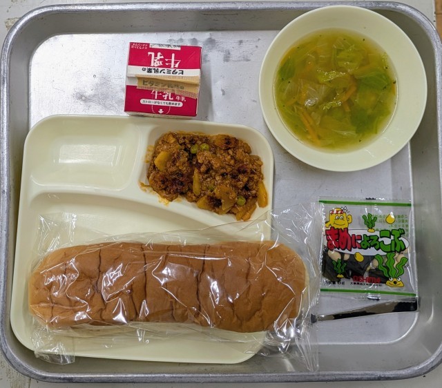 本日のメニューは、黒糖パン 牛乳 じゃがいものミートグラタン レタスのスープ 豆こんぶ でした。