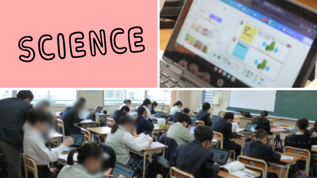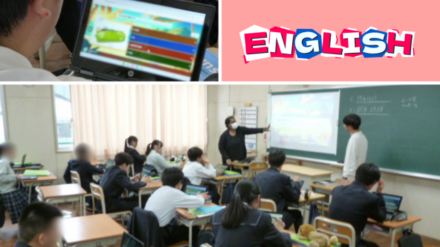 2年生の理科では、教科書から必要な情報を読み取って情報をまとめ、他の人に伝えられるようにしています。また、英語では、今年度新たにいらしたネイティブスピーカーの先生の初めての授業。タブレット端末を活用して、クイズをしながら、先生の自己紹介を聞いています。
