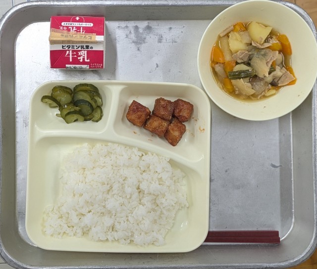 本日のメニューは、ごはん 牛乳 まぐろのオーロラ煮 豚肉と野菜の煮もの きゅうりのゆず風味 でした。