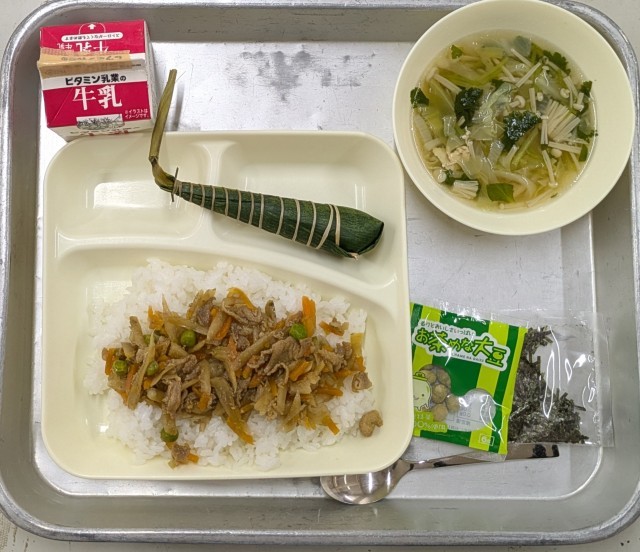 本日のメニューは、ごはん 牛乳 きんぴらちらし きざみのり 五目汁 ちまき まっ茶大豆 でした。