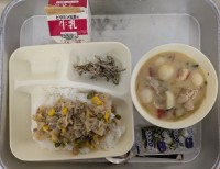 本日のメニューは、かやくご飯 牛乳 鶏肉と野菜の煮もの じゃこ豆 かぶのゆず風味...
