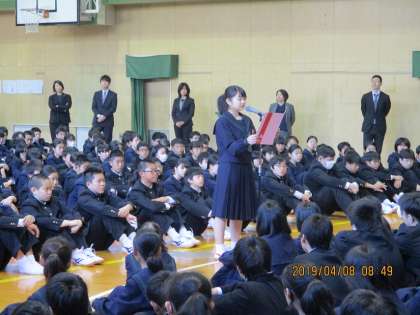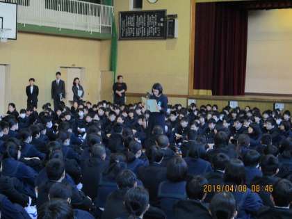 着任式の後、新入生(1年)と在校生(2・3年)の対面式を行いました。新1年生代表挨拶では「自分自身から何事もすすんで取り組みたい。」と力強く挨拶し、在校生代表挨拶では「小学校とは違います。勉強だけでなく、特に部活動にも積極的に活動してほしい。」と挨拶しました。今年度はクラス増で、全校生徒が約600名になりました。全校生徒が一つになった対面式になりました。