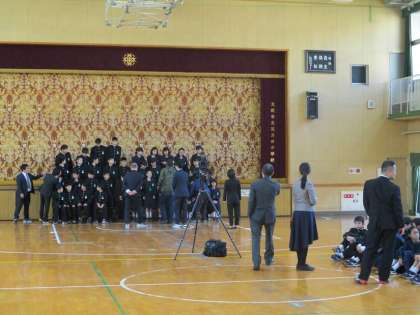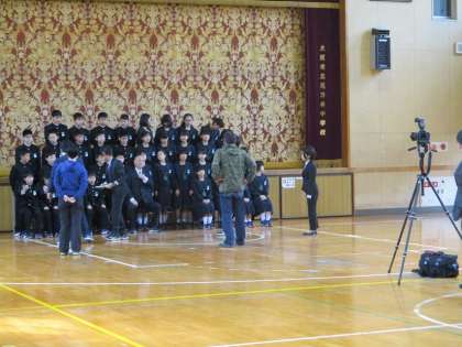 4月9日(火)体育館において、1年生から順番に全学年の学級写真撮影を行いました。クラスごとに整列し、写真屋さんから説明を聞きます。どの学年もクラス替えをしているので、緊張していましたが、その中にも笑顔があふれていました。写真は1年生の様子です。