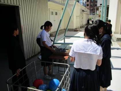 5月7日(火)昼休みより、ボールの貸し出しが始まりました。体育倉庫前で体育委員が受付業務をします。借りるボールが決まれば、生徒手帳と引き換えにボールを借りることができます。天気の良い日には、ボールで遊ぶ元気な声がグラウンドに響きました。
