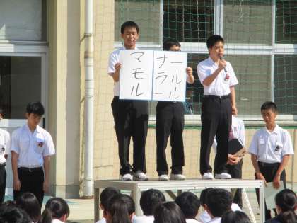 その後、各種委員会の代表より、5月の目標が発表されました。詳細は、先日配布しました生徒会新聞「生徒会掲示板」の裏面に掲載しています。生徒会より「みんなで守る、当たり前」とマナー、モラル、ルールについて、4月と同様の目標説明があり、最後は、今週の予定が連絡され、全校集会は終わりました。