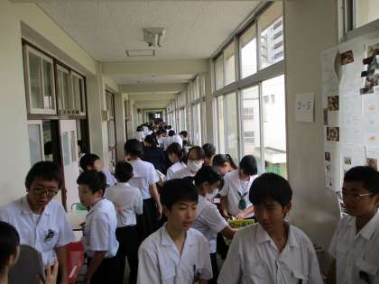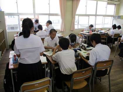 5月17日(金)6限、2年生の総合学習で「国際理解」の班別学習で、世界の国調べに取り組みました。大阪市立中央図書館の協力で、各クラス前の廊下には、多くの図鑑や図書資料が並べられ、多くの生徒であふれました。教室内では、話し合いが行われ、これから発表に向けて準備します。