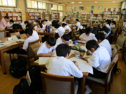 5月22日(水)放課後、4階の図書館において、学校元気アップボランティアが勉強会を行いました。約30名の生徒が集まり、3名の元気アップスタッフにプリントや問題集のわからない部分を個別に教えてもらいました。また、テーブルごとにわからない問題を教えあうこともあり、参加したみんなで学力向上を目指します。明日23日(木)から1学期中間テストが始まります。